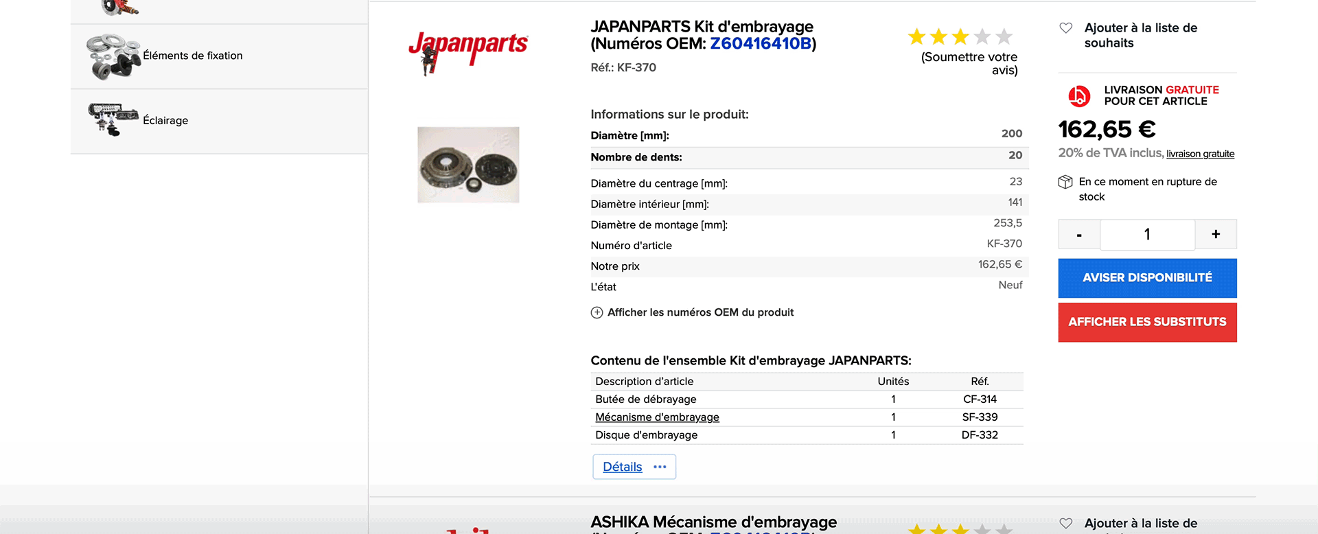 Une liste d'alternatives s'affiche si vous recherchez des pièces par le numéro OEM. Une alternative est un produit qui présente des caractéristiques similaires ou identiques. Après avoir saisi le numéro OEM, comparez les caractéristiques des alternatives proposées dans la liste. Si vous avez le choix parmi un certain nombre de produits dans les résultats de recherche, lisez attentivement et comparez les caractéristiques des produits alternatifs avec votre produit d'origine, ou contactez le service clientèle pour obtenir de l'aide. Si la pièce de rechange dont vous avez besoin n'est pas en stock, utilisez le bouton « Afficher les substituts ». Vous verrez une liste de produits présentant des caractéristiques similaires ou identiques, mais provenant d'autres marques, et éventuellement dans des catégories de prix différentes.