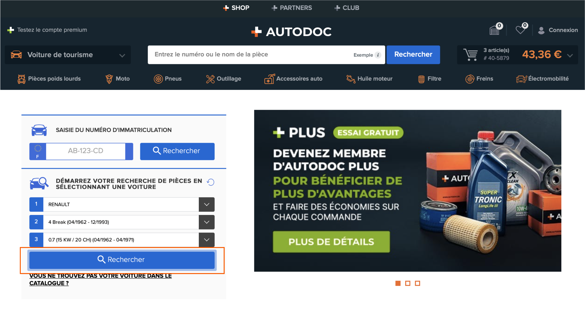Pour trouver la bonne pièce de rechange, entrez les données de votre véhicule (marque, modèle et version du moteur) ou le numéro d'immatriculation.