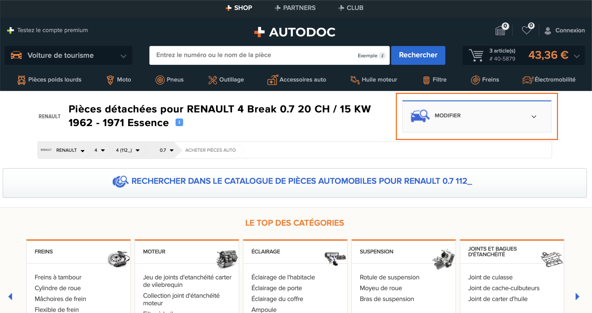 Si vous avez commis une erreur lors de la saisie des données du véhicule, vous pouvez effectuer une correction sur la page du catalogue en cliquant sur MODIFIER.