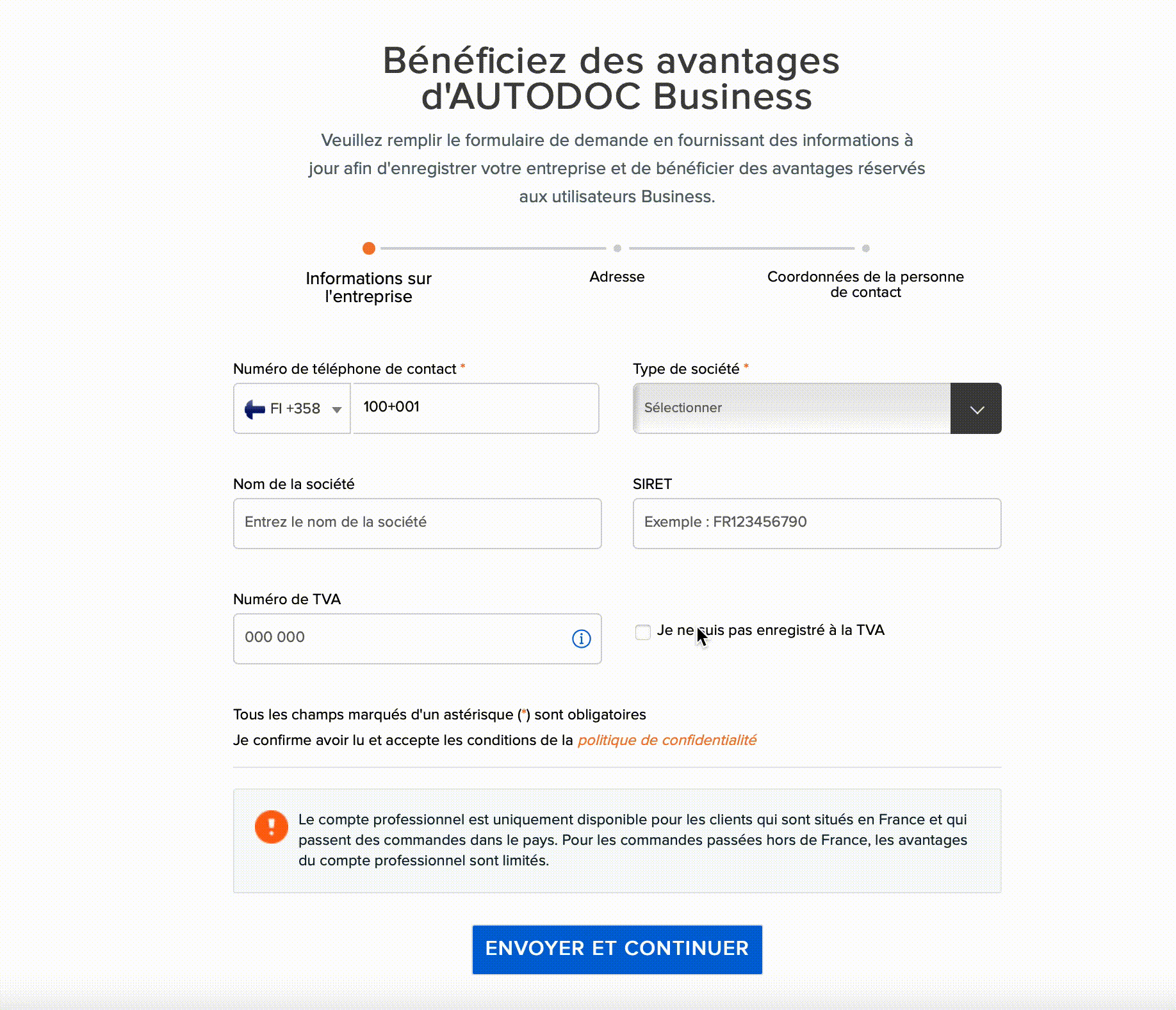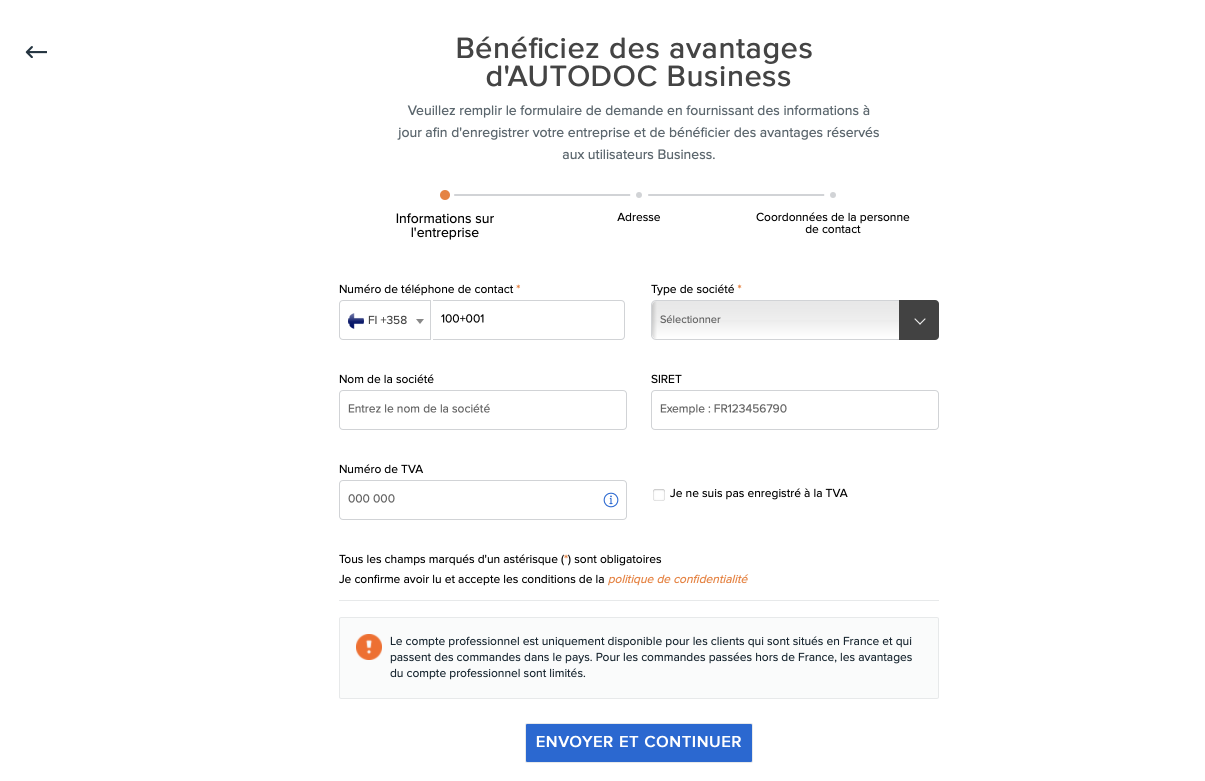 Saisissez les informations relatives à votre entreprise dans un premier temps :