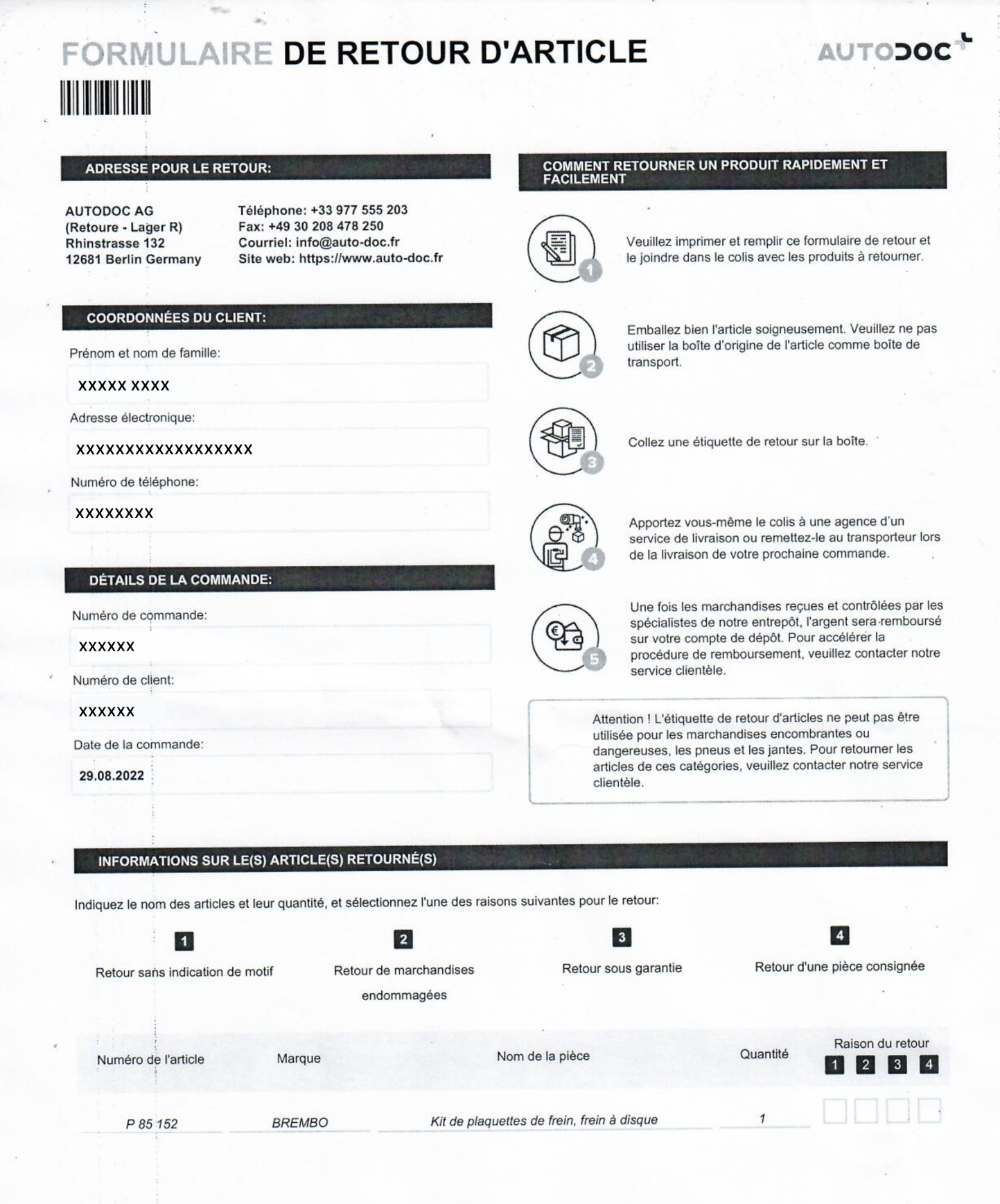 Un formulaire de retour et une étiquette de retour sont joints au colis contenant la commande. Pour retourner un article, vous devez trouver son nom sur le formulaire de retour et sélectionner la raison du retour appropriée. Placez ensuite le formulaire dans la boîte contenant les articles que vous souhaitez retourner. Collez l'étiquette de retour sur la boîte et remettez-la au représentant du service de livraison.