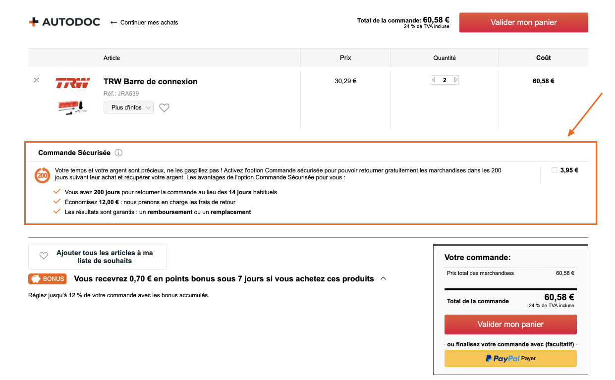 Cette option prolonge la période de retour des produits de 30 à 200 jours ouvrables. Pendant cette période, vous pouvez remplacer ou renvoyer un produit aux frais de notre entreprise. Cette option n'est valable que pour un seul retour ou remplacement dans le cadre de la commande concernée.