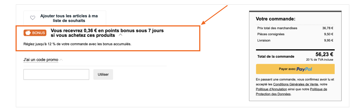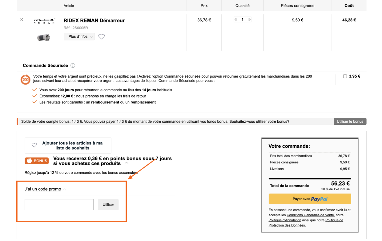 Vous pouvez saisir un code promo à la dernière étape de la procédure de paiement avant de régler votre commande. Le montant total à payer pour les produits sera alors réduit. Si vous avez reçu un code de promo dans une newsletter, faites attention à sa date d'expiration.