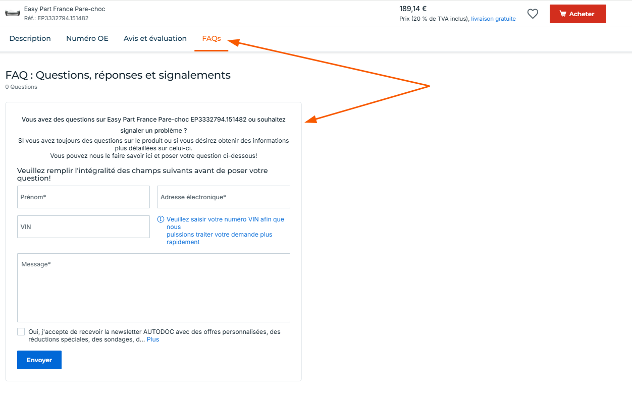 Oui, vous pouvez contacter le vendeur directement via Mon AUTODOC → Mes commandes → Détails de la commande → cliquez sur le bouton « Retours et Assistance » ou utilisez le lien Retours et assistance situé dans le bas de la page du site. Les vendeurs sont censés répondre dans les 3 jours ouvrables.