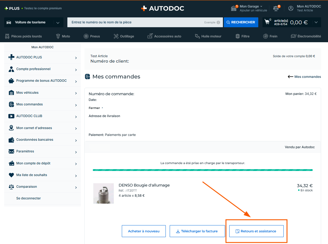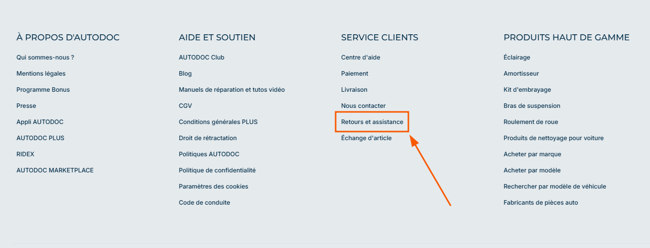 - Mon AUTODOC → Mes commandes → Détails de la commande → en cliquant sur le bouton «Retours et assistance».